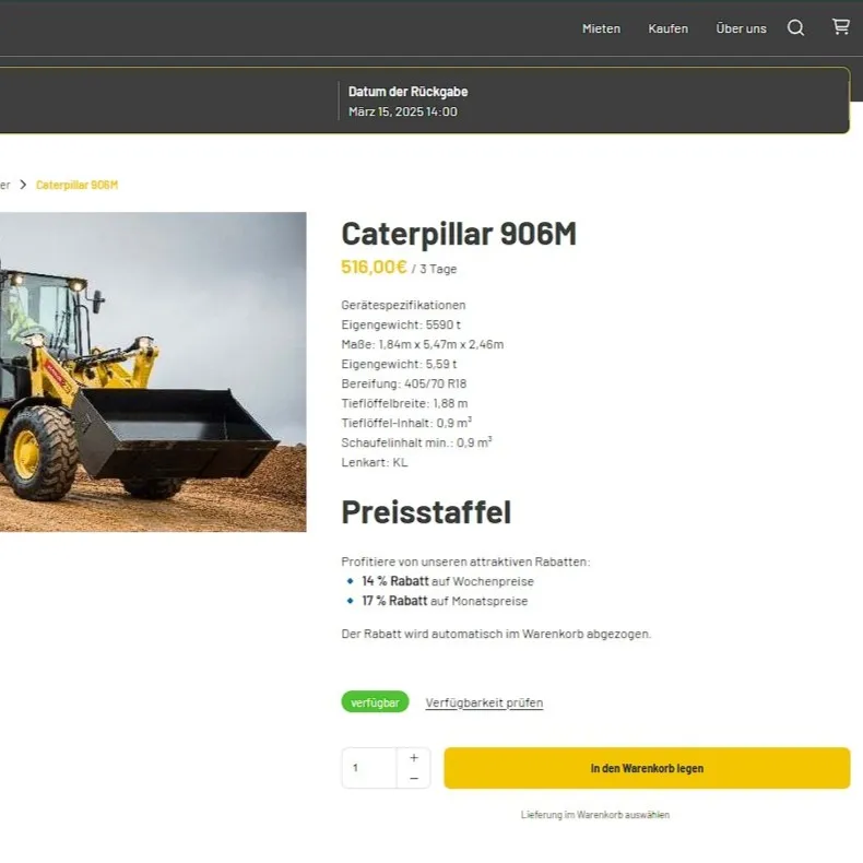 Das ist bei uns ganz einfach und unkompliziert! Stöbern Sie zunächst ganz in Ruhe durch unser umfangreiches Inventar an Baumaschinen oder suchen Sie über die Suchfunktion oben rechts auf der Website gezielt nach den Maschinen, die Sie benötigen. Sie finden bei uns unter anderem Bagger, Planierraupen, Kräne und mehr. Sobald Sie die benötigte Ausrüstung für Ihr Projekt ausgewählt haben, senden Sie eine Mietanfrage oder kontaktieren unser Team. Wir prüfen die Verfügbarkeit, besprechen die Mietkonditionen und erstellen Ihnen ein individuelles Angebot. Nach der Einigung über die Details organisieren wir die Lieferung der Maschinen direkt zu Ihrer Baustelle. Nach Ablauf der Mietdauer kümmern wir uns um die Abholung der Geräte. So erhalten Sie bequem und effizient die Maschinen, die Sie für Ihre Bauprojekte benötigen.