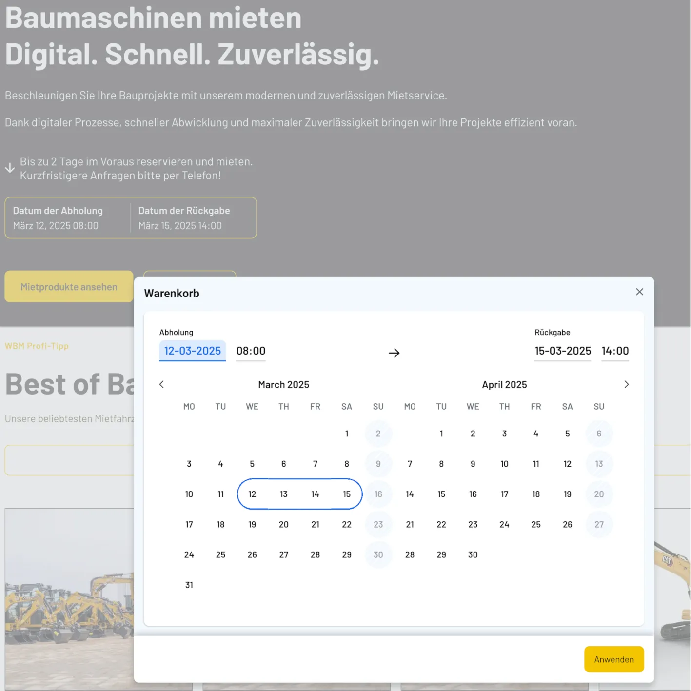 Wählen Sie online die Daten aus, zu denen Sie unsere Baumaschinen benötigen. So sehen Sie sofort die Verfügbarkeit.